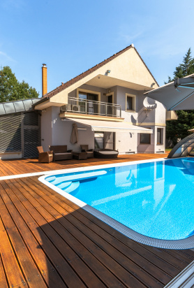 Dominantou exteriéru je slnečný bazén so slanou vodou, vírivka, profesionálny tenisový kurt, altánok s pecou na pizzu, vínna pivnica s vinotékou a priestor na posedenie. Udržiavaný trávnik, studňa na zavlažovanie, samostatná garáž pre záhradnú techniku a viacero skladovacích priestorov robia z tejto nehnuteľnosti ideálne miesto na oddych aj reprezentatívne využitie.